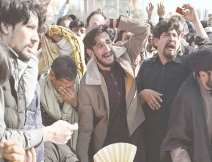 People weep beside the coffins of their relatives during funeral prayers a day after a suicide bombing at an imambargah in Islamabad. Photo: AFP