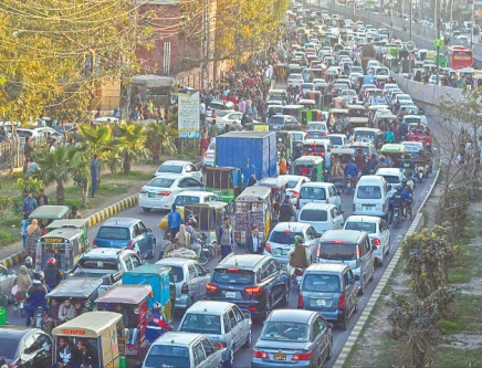 A large numbe of vehicles are struck in traffic jam on Ravi Road near Greater Iqbal Park on the third day of Basant celebration in the city. Photo: APP