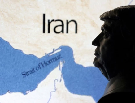 A map showig the Strait of Hormuz and Iran is seen behind a 3D printed miniature of US President Donald Trump in this illustration taken June 22, 2025.FILE PHOTO: REUTERS