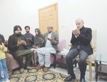 PM Shehbaz Sharif offers fateha for Oun Abbas, one of the victims of the Islamabad suicide bombing, at his family residence. PHOTO: APP