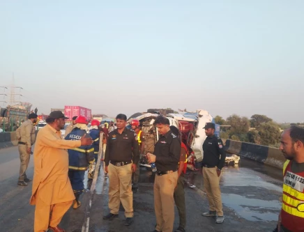 At least 13 killed as oil tanker collides with bus on M-9 Motorway near Karachi: police