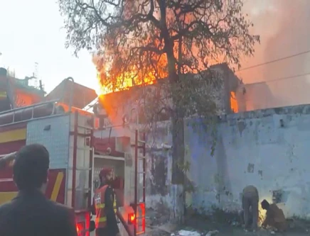 A fire broke out in a warehouse building near Barkat Market, close to a petrol pump, on Friday afternoon, triggering a large-scale response from Rescue 1122.