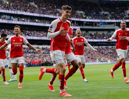Kai Havertz celebrates scoring Arsenal’s third goal against Tottenham during the first half. Photo: AFP/File
