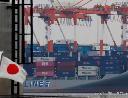 A Japanese national flag flutters in front of cargo containers at an industrial port in Tokyo, Japan, February 16, 2026. PHOTO: REUTERS