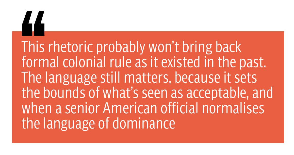 This rhetoric probably won't bring back formal colonial rule as it existed in the past, because today power runs through money, supply chains, tech standards, and security dependencies, rather than through excessive territorial control. The language still matters, because it sets the bounds of what's seen as acceptable, and when a senior American official normalises the language of dominance, it lowers the diplomatic cost of coercive economic measures and conditional security arrangements, while signalling to allies that the decades-old fiction of equal partnership is becoming harder to sustain.