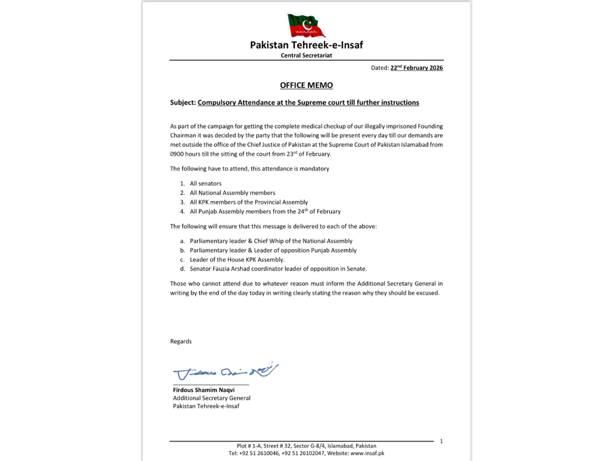 Pakistan Tehreek-e-Insaf (PTI) has directed all its lawmakers to ensure mandatory attendance as the party prepares to hold daily protests outside the Supreme Court of Pakistan from February 23, as part of a campaign seeking a complete medical checkup of its jailed founder Imran Khan.