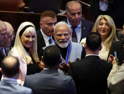 India's Prime Minister Narendra Modi (C) is greeted by Israeli lawmakers after his speech at the Israeli parliament, the Knesset, in Jerusalem on February 25, 2026. — AFP
