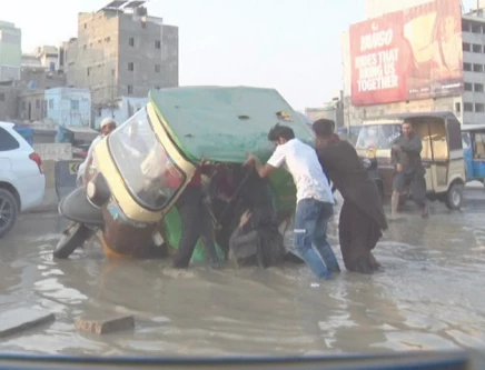 During a ground visit by The Express Tribune, two rickshaws plunged into the same water-filled crater within minutes — one carrying women passengers — prompting bystanders to rush for rescue. A motorcyclist was also injured after losing control and falling into a ditch. Locals later placed wooden barricades at the spot in a desperate attempt to prevent further accidents.