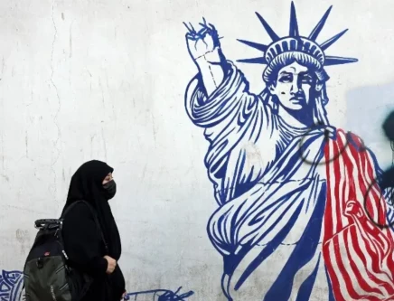 An Iranian woman walks past an anti-US mural next to the former US embassy in Tehran on February 26. — AFP