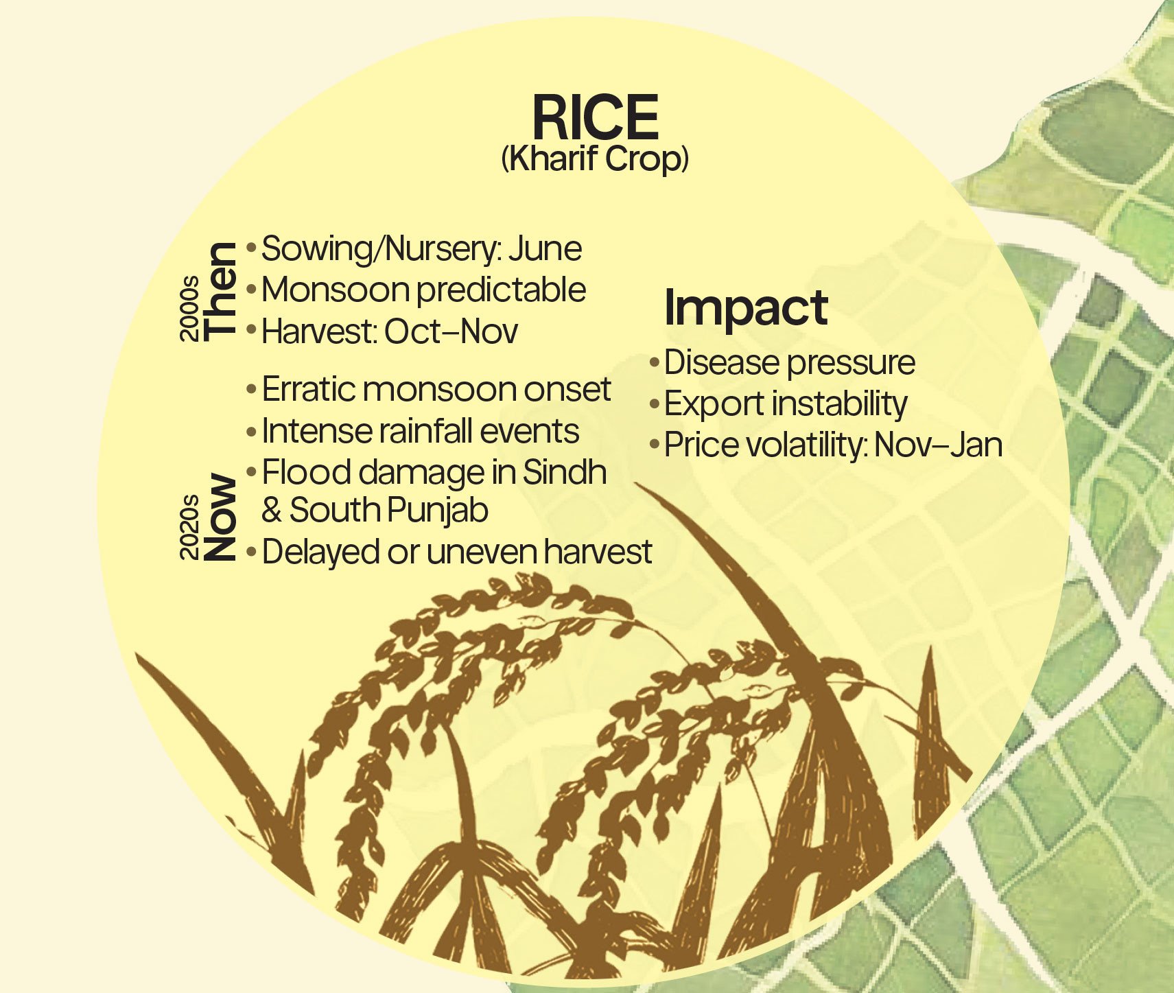 Rice faces a different form of instability. Monsoon rainfall is increasingly characterised by delayed onset, short intense bursts and longer dry spells between events. Instead of steady seasonal progression, farmers confront abrupt flooding followed by mid-season drought stress. The 2022 floods, he points out, reduced national cotton production by nearly 30 to 40 percent, demonstrating how extreme rainfall events translate into immediate agricultural loss.