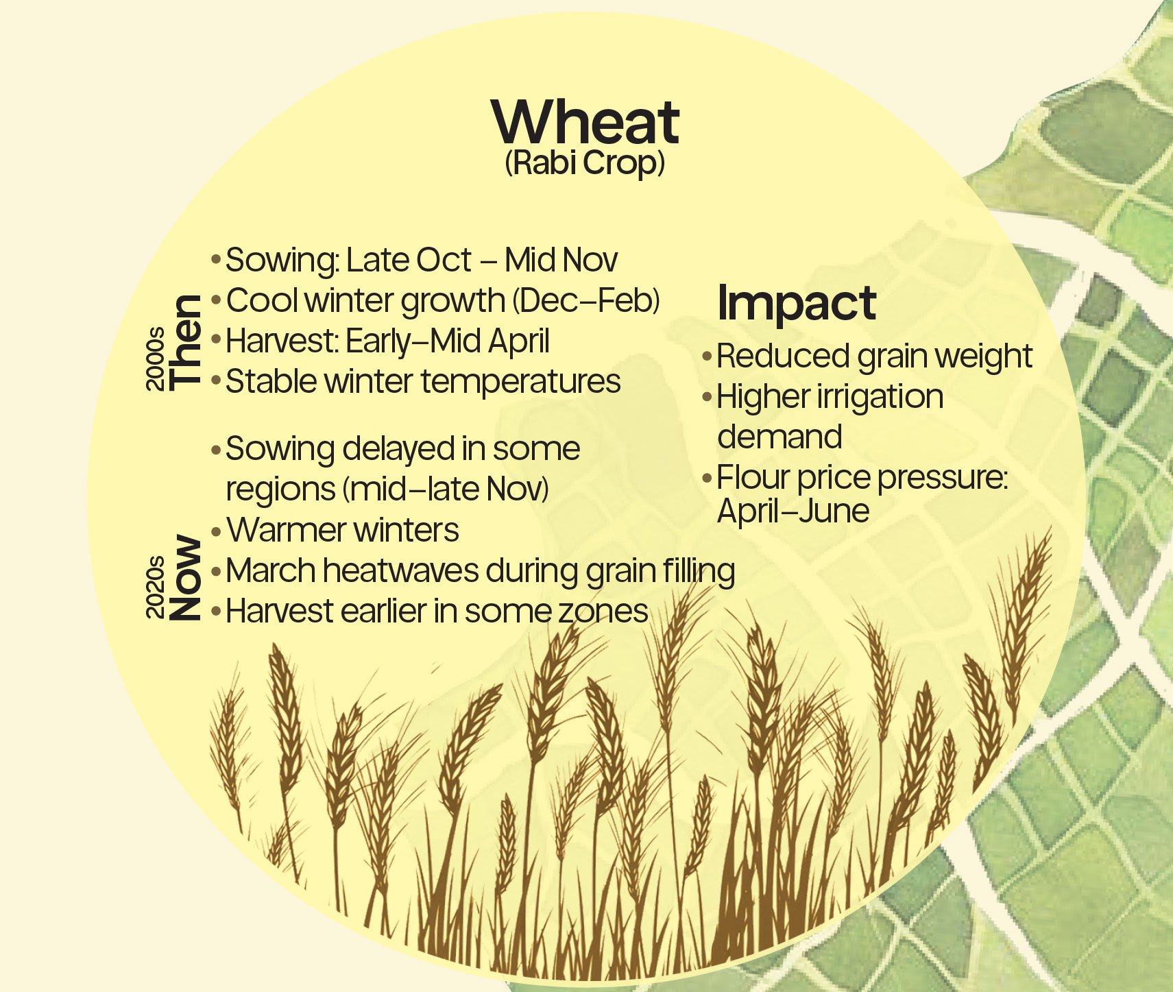 The combined effect is cumulative. A compressed wheat harvest window, followed by erratic rice transplantation, followed by heat stress in vegetable belts, creates overlapping risk rather than isolated shocks.