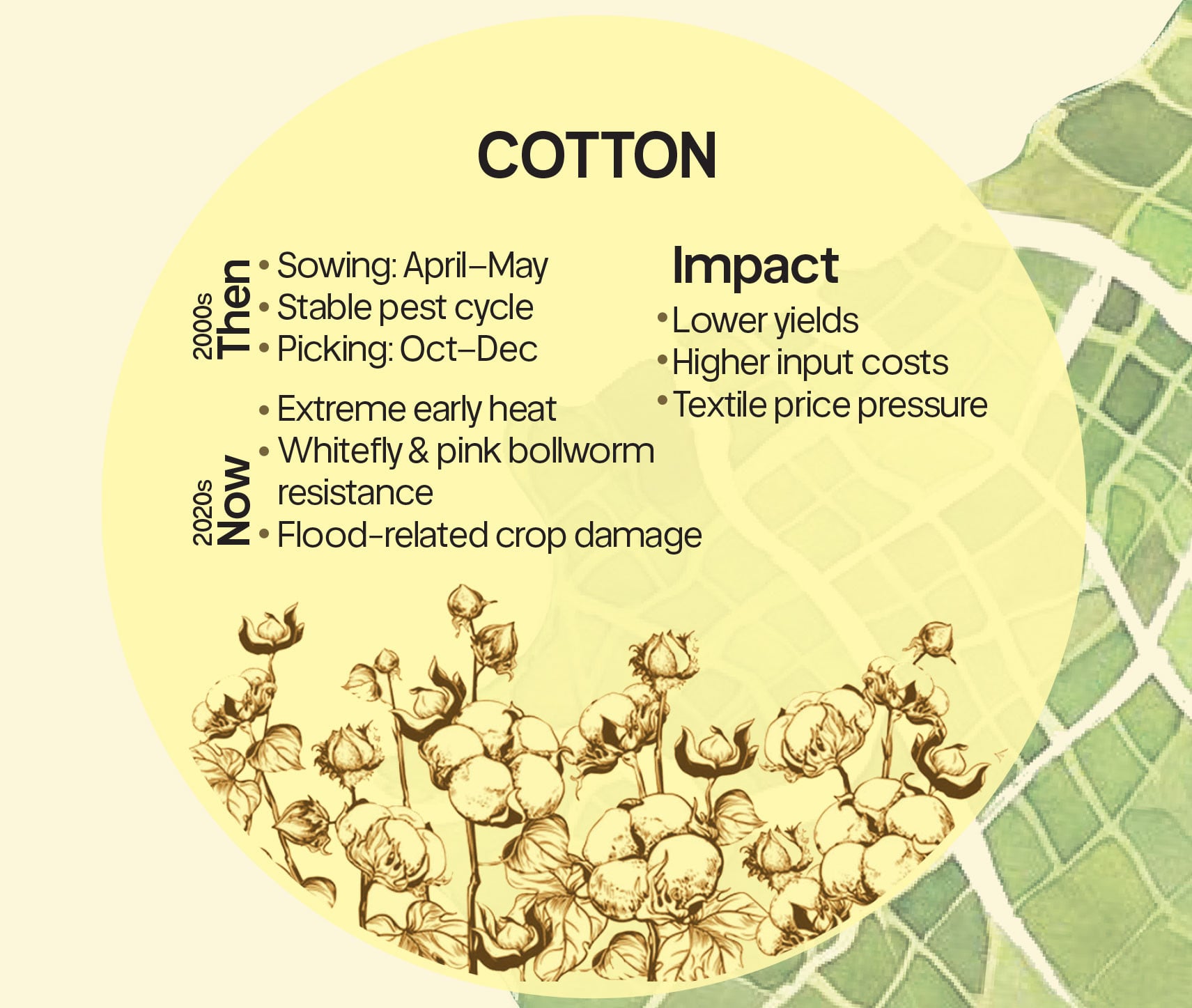 The pressures are layered. Heat arrives earlier. Monsoons concentrate into shorter windows. Water distribution becomes less predictable. Pest survival increases through milder winters. Each factor alone can be managed. Together, they redefine planning.