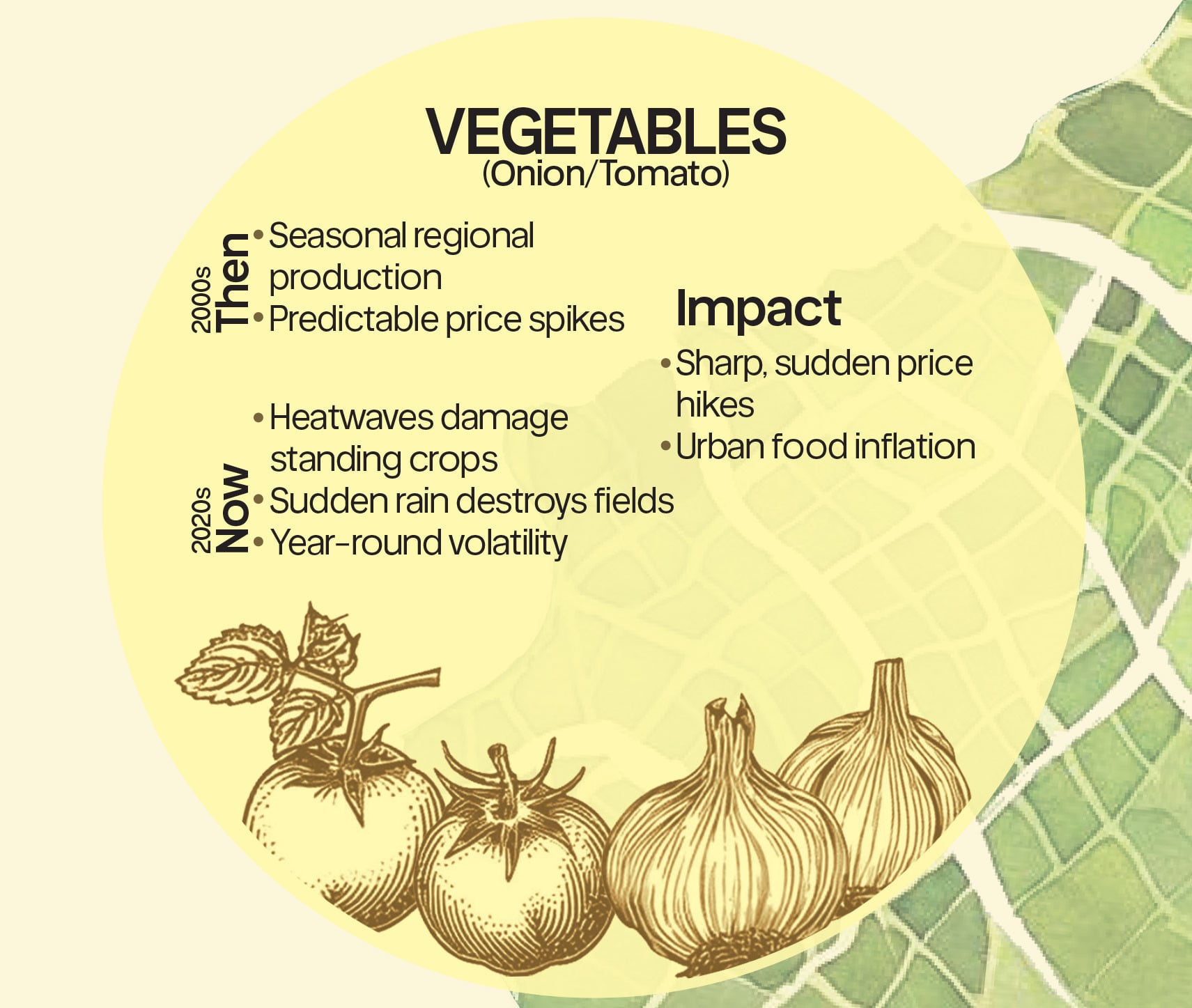 A single heatwave during flowering can reduce supply. A spell of excessive rainfall can damage standing crops and disrupt transportation. Unlike wheat, vegetables lack buffer stocks and procurement cushions. The price response is immediate and visible in urban markets.