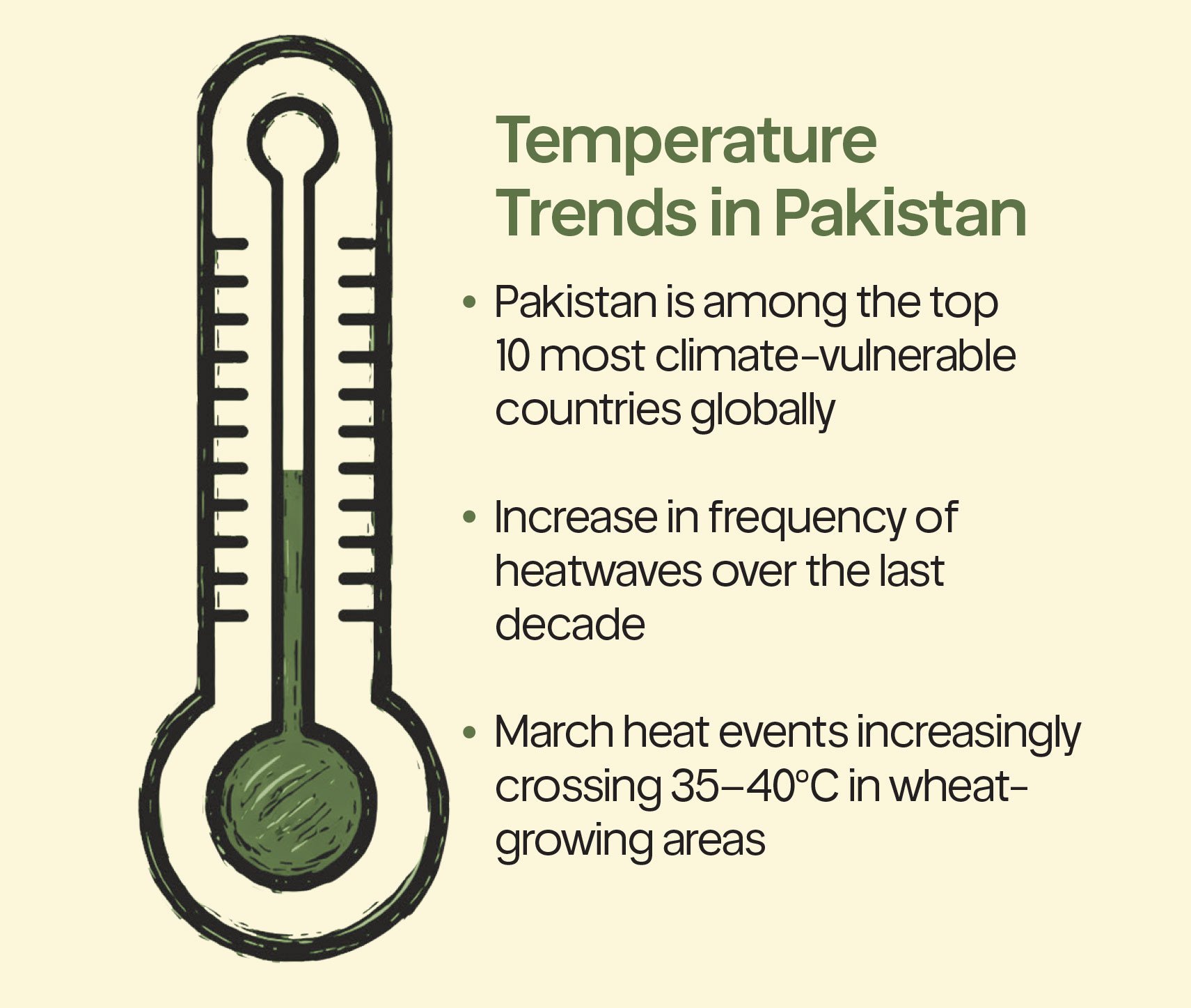 Wheat, Pakistan’s staple crop, is especially vulnerable during its grain-filling stage. When temperatures exceed 32 to 35 degrees Celsius in March or early April, grain weight declines. According to Kumbhar, studies show that each one-degree rise above the optimum during grain filling can reduce yield by five to seven percent.