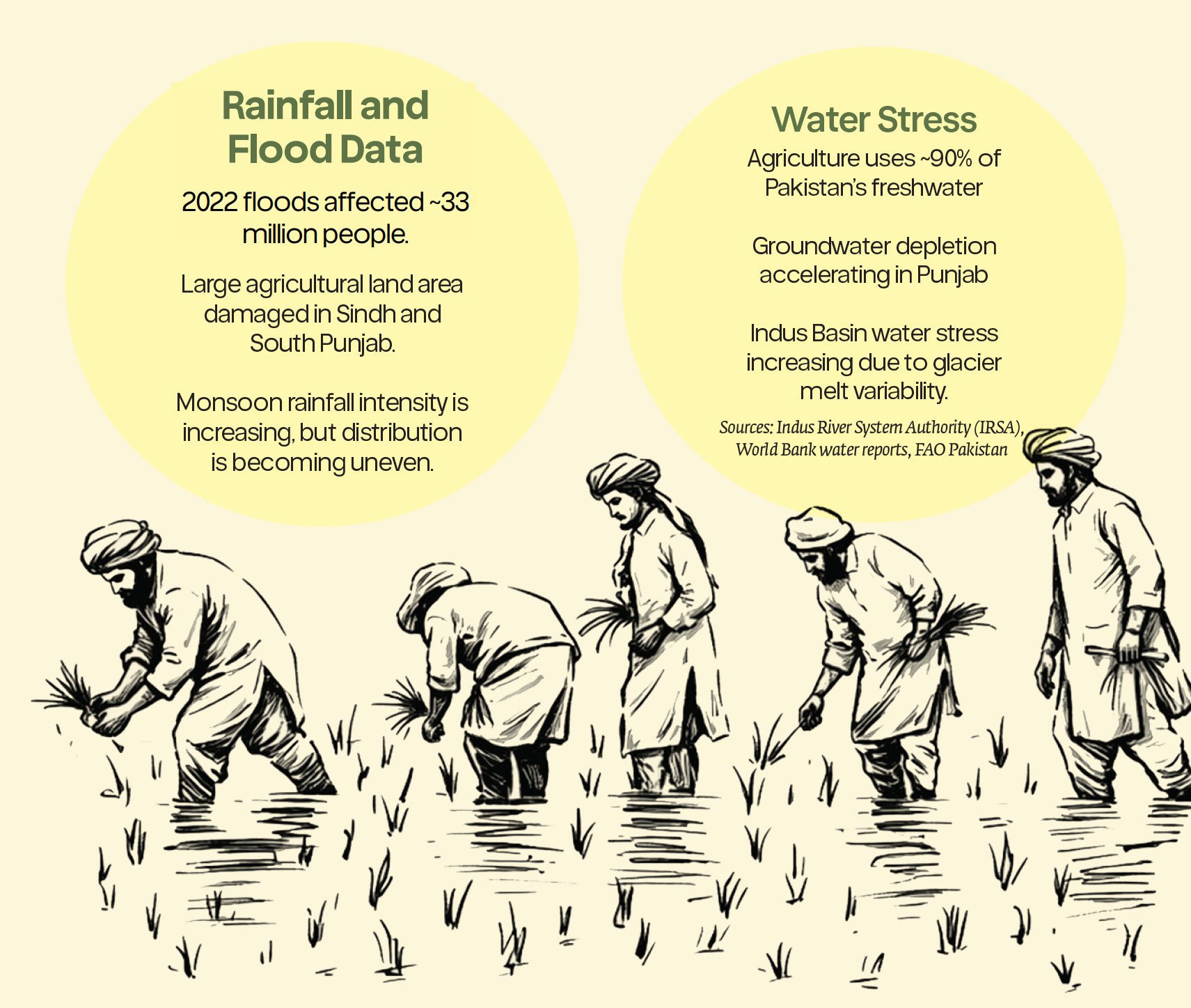 Harvest cycles are also compressing. Higher temperatures accelerate crop maturity, reducing the duration available for optimal growth. Chronic water shortages in parts of Sindh have further affected rice and sugarcane productivity, particularly in tail-end canal command areas.