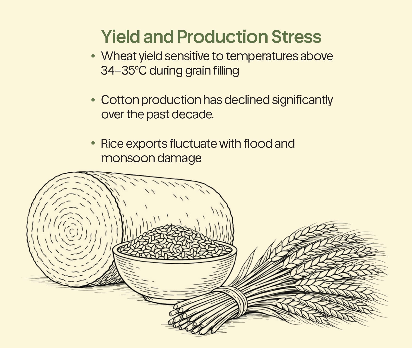 That uncertainty ripples outward. When wheat yield declines, procurement pressures rise. When rice transplanting is delayed, harvesting shifts. When vegetables are damaged by heatwaves or excessive rainfall, supply thins rapidly.