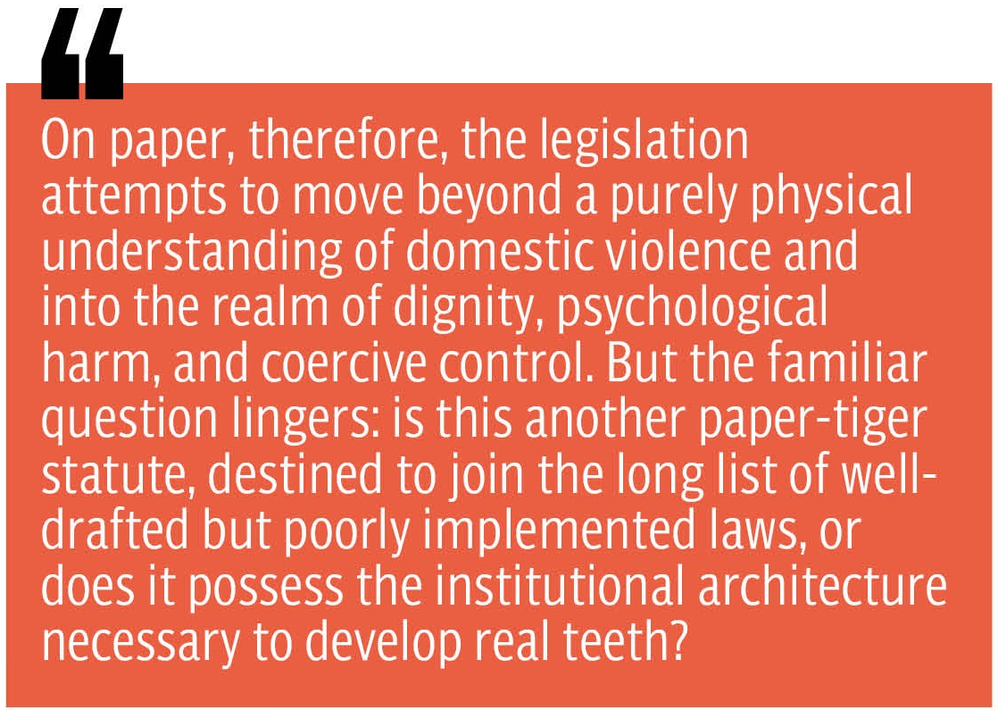 On paper, therefore, the legislation attempts to move beyond a purely physical understanding of domestic violence and into the realm of dignity, psychological harm, and coercive control.