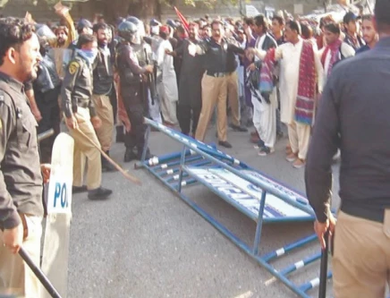 According to officials, law enforcement personnel resorted to baton charges and tear gas to disperse the crowd, taking several protesters into custody. The area reportedly resembled a battlefield during the confrontation, with demonstrators throwing stones at police, while authorities maintained heavy security deployment, including water cannons and police vans. The clashes caused severe traffic jams across Saddar and surrounding areas.