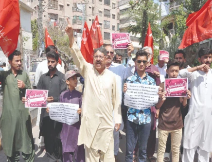 Members of the Communist Party of Pakistan hold a protest rally in Hyderabad against the assassination of Iran’s Supreme Leader, Ayatollah Ali Khamenei, in US-Israeli strikes. Photo: PPI