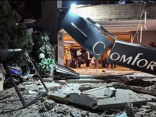 This frame grab from AFPTV video footage taken on March 4, 2026 shows first responders inspecting the damage at Comfort Hotel after it was hit by an Israeli strike in Beirut's eastern suburb of Hazmieh. PHOTO: AFP