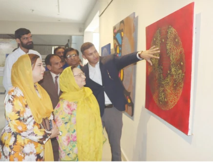 MNA Tahira Aurangzeb and Parliamentary Secretary of Information and Culture Shazia Rizwan admire the Islamic calligraphy artworks by renowned artist Zakria Jalal on display at Punjab Council of Arts in Rawalpindi. Photo: Express