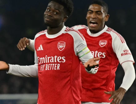 Saka took possession on the right flank and advanced to the edge of the area for a fierce shot that deflected off Baleba and somehow squirmed through keeper Bart Verbruggen's legs.