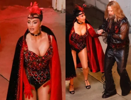 Photos from the set show the 45-year-old reality star and entrepreneur wearing a sparkling red-and-black corseted bodysuit paired with long gloves, glittering heels and a dramatic feathered headpiece. The elaborate outfit completes her showgirl transformation as cameras rolled during filming in Los Angeles.