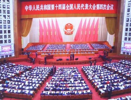 Techincians look on under a screen broadcasting the opening session of the National People's Congress (NPC) at the Great Hall of the People in Beijing, China March 5, 2026. Photo: Reuters