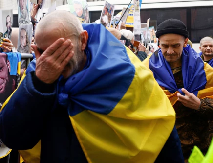 Tearful relatives greeted loved ones, many of them draped in Ukrainian flags, as they emerged from a bus that had arrived at an undisclosed location to chants of "Welcome!"