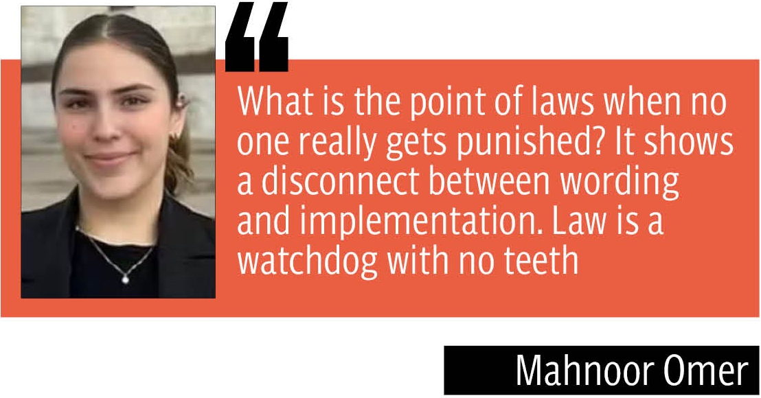 The law, Omer argued, is like a watchdog with no teeth. While the law mentions availability of legal aid and assistance, there is hardly any for women, she explained, adding, “What is the point of laws when no one really gets punished? It shows a disconnect between wording and implementation.”