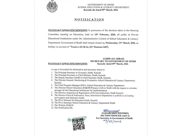Sindh announces school holiday for March 11