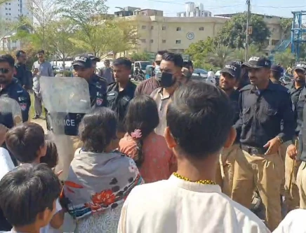 The protest took place on Monday against the killing of a suspect named Shayan Baloch and led to a major traffic jam in the area, blocking both sides of the road between Race Course and Gizri.