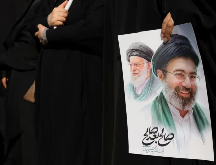 A woman holds an image of Iran's new supreme leader, Mojtaba Khamenei, alongside late Iranian Supreme Leader Ayatollah Ali Khamenei, during a funeral ceremony for the Iranian military commanders who were killed in strikes, amid the U.S.-Israeli conflict with Iran, in Tehran, Iran, March 11, 2026. Majid Asgaripour/WANA (West Asia News Agency) via REUTERS