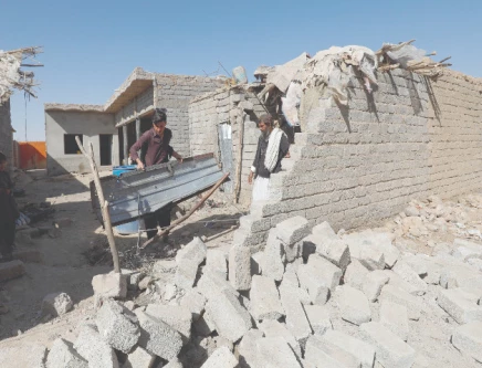 People inspect the damage after a drone hit a residential house in the Sarah Gharghai area in Quetta. Photo: Reuters