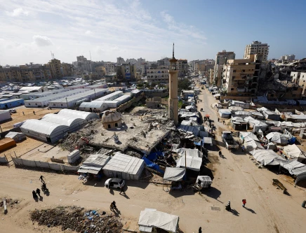 A mosque, destroyed during the two-year Israeli offensives, is surrounded by tents for displaced Palestinians, in Gaza City, February 11, 2026. Photo: Reuters