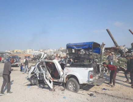 Palestinians inspect the site of an Israeli strike that targeted a police vehicle in Zawaida, in the central Gaza Strip. Photo: AFP