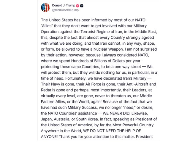 "Because of the fact that we have had such Military Success, we no longer 'need,' or desire, the NATO Countries' assistance, WE NEVER DID! Likewise, Japan, Australia, or South Korea," Trump posted on his Truth Social network, adding: "WE DO NOT NEED THE HELP OF ANYONE!"
