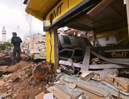 This photograph taken during a media tour organized by the Hezbollah shows a photographer standing next to an overturned ambulance at Nabi Sheet town after an Israeli military operation in the Bekaa Valley of Lebanon, on Mar. 7, 2026. PHOTO: AFP