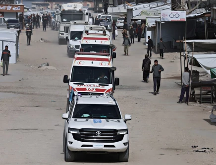 A UN vehicle leads ambulances carrying war-wounded people and patients who leave Gaza, for treatment abroad, through the Rafah border crossing between Gaza and Egypt after it was opened by Israel on Thursday for a limited number of people, in Khan Younis in the southern Gaza Strip, March 19, 2026.PHOTO: REUTERS