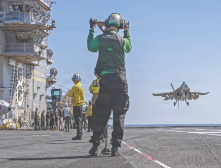 US sailors observing as an F/A-18E Super Hornet aircraft, assigned to Strike Fighter Squadron 31, approaches the flight deck of the world’s largest aircraft carrier, USS Gerald R Ford. Photo: AFP