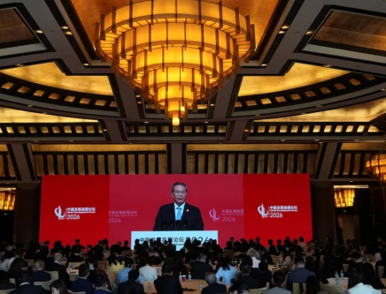 Chinese Premier Li Qiang is seen on a big screen live broadcasting his speech at the opening of the China Development Forum 2026. PHOTO: REUTERS