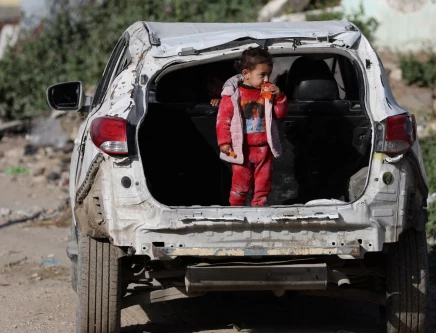 A Palestinian child stands in the trunk of a damaged car near a cemetery during Eid al-Fitr, in Gaza City, March 20, 2026. REUTERS