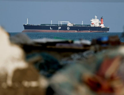 An LPG gas tanker at anchor as traffic is down in the Strait of Hormuz, amid the U.S.-Israeli conflict with Iran, in Shinas, Oman, March 11, 2026. PHOTO: REUTERS