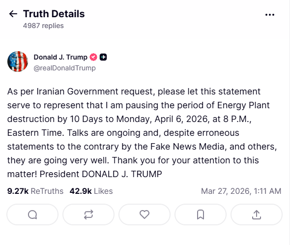 "As per the Iranian Government request... I am pausing the period of Energy Plant destruction by 10 Days to Monday, April 6, 2026, at 8pm, Eastern Time," he posted.