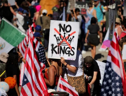 A protester holds a sign reading "NO KINGS" with a crown illustration crossed out during a "No Kings" protest against US President Donald Trump's policies, in Los Angeles, California, on October 18, 2025. PHOTO: REUTERS