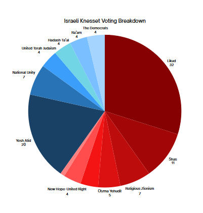 Centrist and left-leaning groups like Yesh Atid, National Unity, and Arab parties, including Ra’am and Hadash-Ta’al, led the opposition, even though Hadash Ta'al has not aligned itself with either political bloc (coloured in blue).