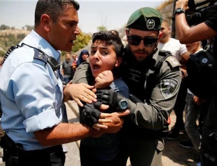 A Palestinian youth is arrested by an Israeli border police officer. PHOTO: REUTERS