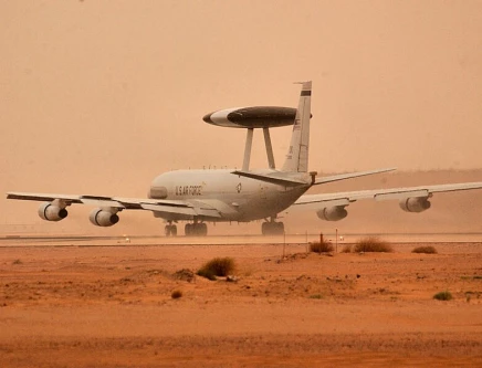 An E-3 AWACS aircraft deployed to the 363rd Air Expeditionary Wing takes off for a mission during a sand storm March 25. SOURCE: WIKIPEDIA