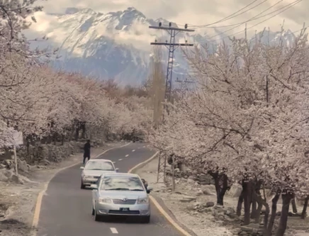 Further west, the transformation is mirrored in the famed Hunza Valley, where the annual cherry blossom season is now in full swing. From mid-March to mid-April, the valley is enveloped in shades of pink and white, with flowering trees stretching across villages and mountainsides beneath clear blue skies.