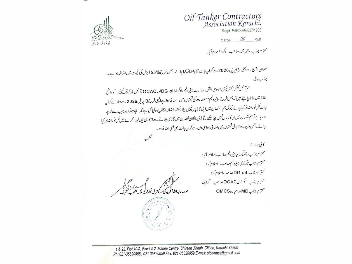 He added that Petroleum Minister Ali Pervaiz Malik had been contacted multiple times, and letters had been sent requesting negotiations. Afridi said changes in pipeline quota were also affecting tanker owners, adding, “Until freight rates are increased, tankers will not operate.”